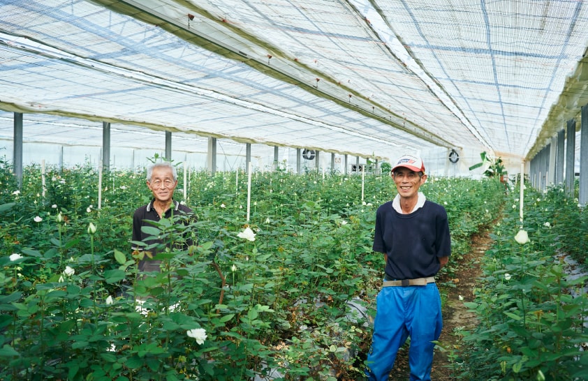 栽培ハウスを訪れると、黙々と作業する人が。バラ栽培歴約30年のベテランスタッフ、西本正和さん、兼重正明さんです。65歳以上のシニアスタッフ16名と50代のエルダースタッフ数名をまとめ、生産管理の中核を担われています。お2人に、ホシファームのバラづくりについてお聞きしました。