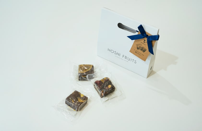 一方、自社ブランドであるホシフルーツの中で、特に人気が高いのは「ナッツとドライフルーツの贅沢ブラウニー」。セミドライフルーツとナッツを敷き詰めた一口サイズのチョコブラウニーだ。フルーツとナッツぎっしりの鮮やかな見た目、しっとりとした美味しさ、アルコール不使用でお子さんや妊婦さんでも食べられる安心感は、まさにアデリーが目指す「もらって嬉しい、食べて美味しい」を体現している。