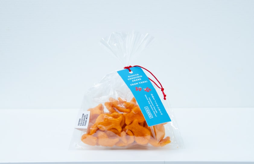 サイズは大小2種類で展開している。小さいサイズは金魚すくい袋を模したデザインで、330円(税抜)と手頃な価格のため、お土産に最適だ。一方、大きいサイズは自立するスリーブ型で、裏面には毎年夏に開催される「柳井金魚ちょうちん祭り」の紹介文を掲載。手に取った人が興味を持つきっかけになるだろう。「その他にも、金魚鉢をイメージした波型のパッケージにするなど、こだわりのデザインを施しています」と吉川さん。手に取ってじっくりご覧いただきたい。