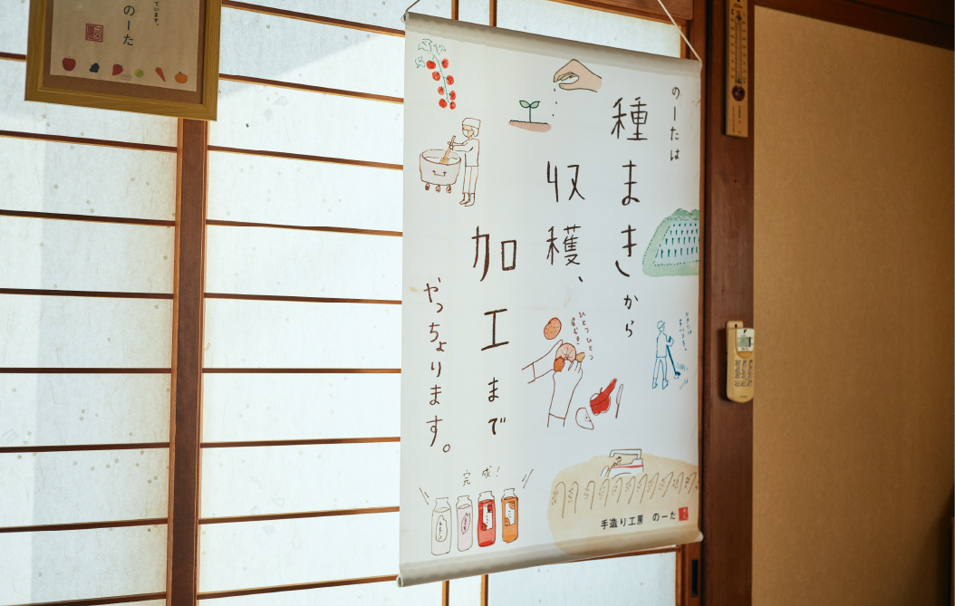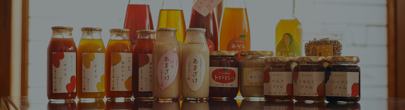 田布施駅から光上関線(県道23号)を経由して車で7分ほど。閑静な住宅街の一画に「株式会社 農多」の工場があります。併設直売所の「手造り工房 のーた」では山口県産の食材を加工した甘酒やジュース、シロップなどを販売。原料となる米や野菜は近隣の耕作放棄地を利用して自社栽培されたものです。