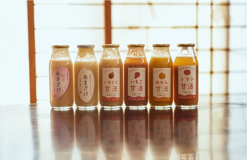 農多の甘酒は自社栽培の米と米麹だけでできている。教員時代に培養を学んだ伊藤さんが米麴まで自ら作って仕込む看板商品だ。定番の「あまざけ」をベースに、季節ごとの野菜や果物をプラスした「トマト甘酒」などのミックス甘酒も展開。その他にも紅麹を入れた「桜色あまざけ」など、色合いや風味の違いを比べるのも楽しい各種甘酒がラインナップされている。