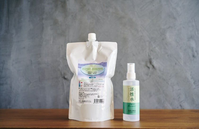 最初に手掛けた商品「活性水スプレー(右)」と「スーパーミネラル(左)」
