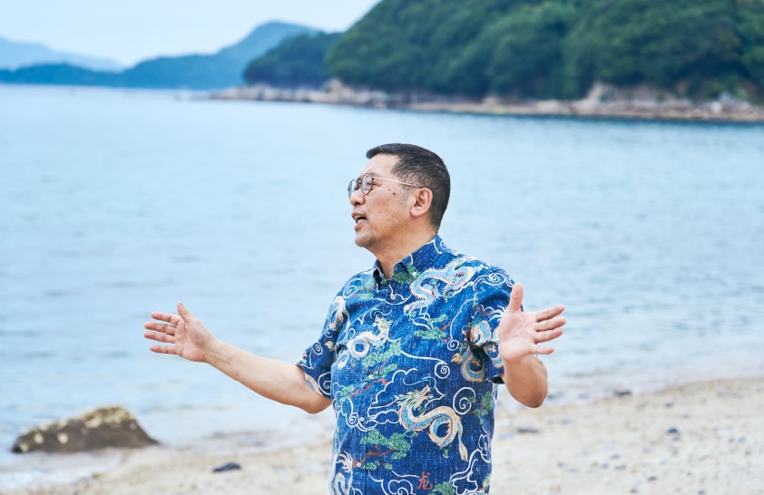 周防大島の歴史ある活魚料理店に生まれ、立岩海水浴場の前にクレスト・オブ・ザ・ウェイヴ立岩を開業した村上さん。あるとき恩師と慕う人物より、店のすぐそばにある海水を生かして塩作りを始めてはどうかと勧められた。すでに料理人として高い評価を得ていたが、かねてより抱いていた「社会のために何かしたい」という思いを原動力に一念発起。収益を志ある若者の支援に充てると誓い、塩作りを始めた。