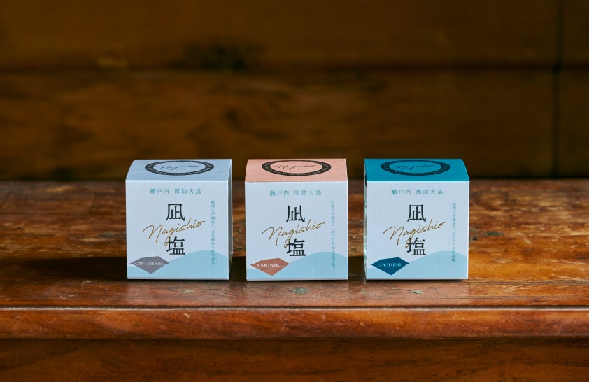 続いて紹介するのは「凪塩(なぎしお)シリーズ」の3種。JR西日本との「てみてプロジェクト」を通じて作られた。より食にフォーカスし、食材によって製塩方法を調整。用途を明確に提示することで、使いやすさを意識した。「凪塩 SASHIMI(サシミ)」はクリアな塩味の中にまろやかなテイストがあり、魚本来の美味しさを際立たせる。「凪塩 YAKINIKU(ヤキニク)」は力強い塩味と旨味を多く含んでおり、噛み締めるたびに広がる肉の旨味と塩の余韻が楽しめる。「凪塩 GIN-SHARI(銀シャリ)」は米のやさしい甘味を引き立たててくれる。シンプルな塩むすびに合わせたい。もちろん、用途を限定しているわけではない。例えばYAKINIKUはチョコレートのビターな味わいにもマッチするという。