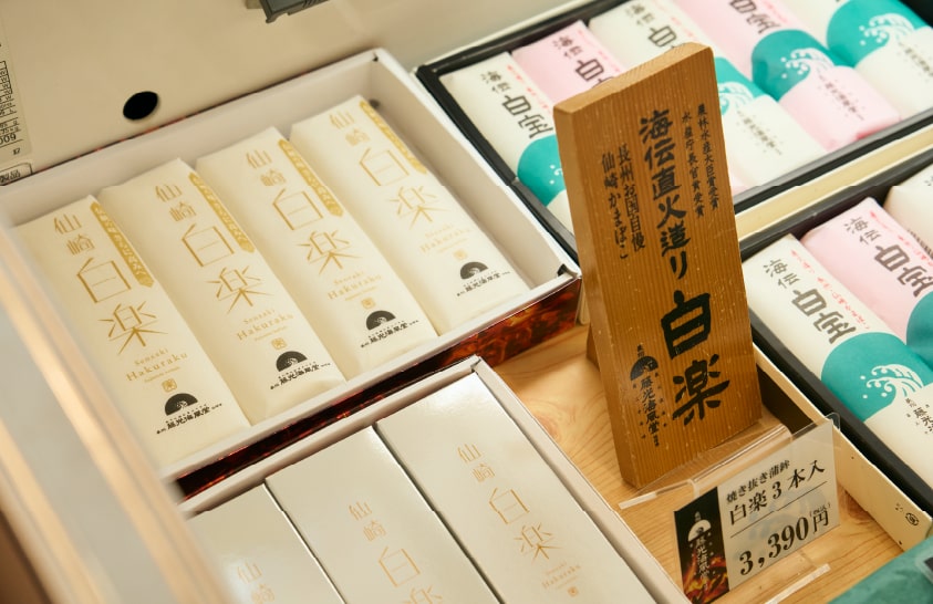 グローカルチャーの精神を体現するのが「白楽」だ。焼き抜きの技法により板の下からじっくり焼いた昔ながらの蒲鉾で、風味、食感ともに最高峰といえる白楽。近海で獲れた高級魚・えそを自社工場ですり身にし、手間をかけて丁寧に仕上げている分、収益は出にくい。それでも、白楽という商品を製造し続けて技術や職人を絶やさないことが重要という。「時代の流れに沿ってダイナミックな変革を遂げても、忘れてはならない原点やルーツは必ずある。それを継承しながらより広く発信することが成長の軸です」という言葉が印象的だった。