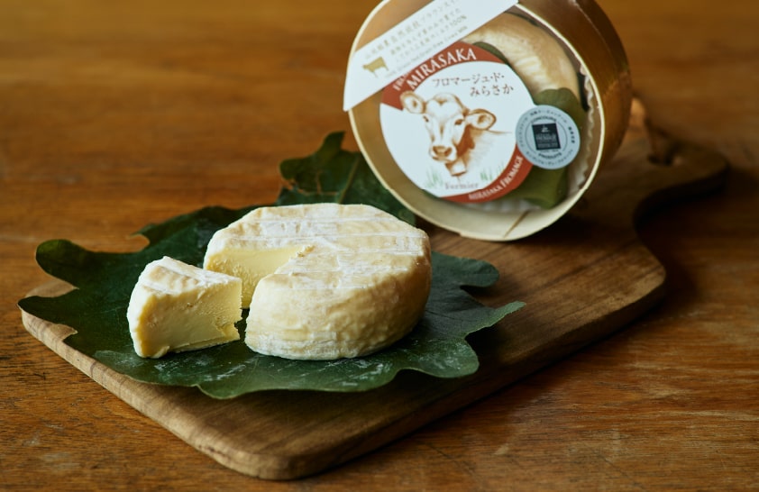 放牧されたブラウンスイス牛のミルクを100%使用し、白カビタイプの熟成チーズとして仕上げた「フロマージュ・ド・みらさか」。初期段階では酸味があり、あっさりとした味わいだが、熟成が進むにつれて表面からトロトロになり、濃厚な風味へと変化していく。購入後に自宅の野菜室などで数週間置くことで、さらに味わいが深まるのも魅力のひとつだ。