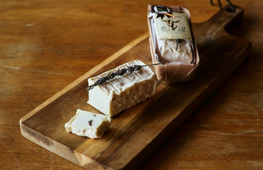 自然放牧で育ったヤギのミルクを使用し、白カビ熟成タイプに仕上げた「カレ・ド・ラヴォンド・シェーブル」は、春から秋にかけてのみ登場する季節限定チーズ。特徴は、地元産のラベンダーをあしらった見た目の美しさと、その香りの爽やかさだ。味わいはヤギ特有のクセを抑えつつも、しっかりとした旨味があり、熟成が進むにつれて柔らかく濃厚になる。