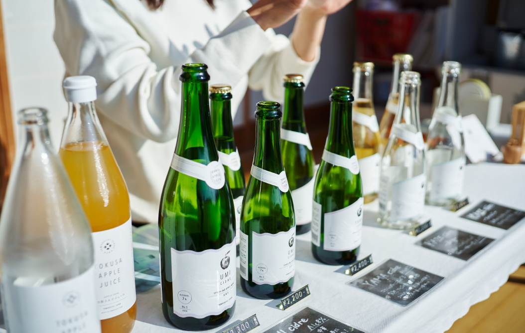 現在は辛口の「UMI(海シードル)」と甘口の「YAMA(山シードル)」を軸に、完熟前のりんごをうまく活用した限定商品「KAZE(風シードル)」や、「徳佐りんご100%ジュース」なども手掛けている原田さん。やまぐちシードルの商品は販売店とオンラインショップに加え、県内各地の道の駅や酒屋でも買い求めることができる。販路は協力隊時代の人脈などを通じて次第と拡大していった。興味を持った販売店から直接連絡が入るケースもあるという。