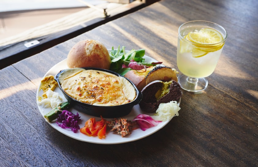 さらに、2階は約30席のテーブル席と和室を備えたカフェスペースで、ランチタイムにはパンと野菜たっぷりの惣菜を組み合わせたデリプレートを堪能できます。