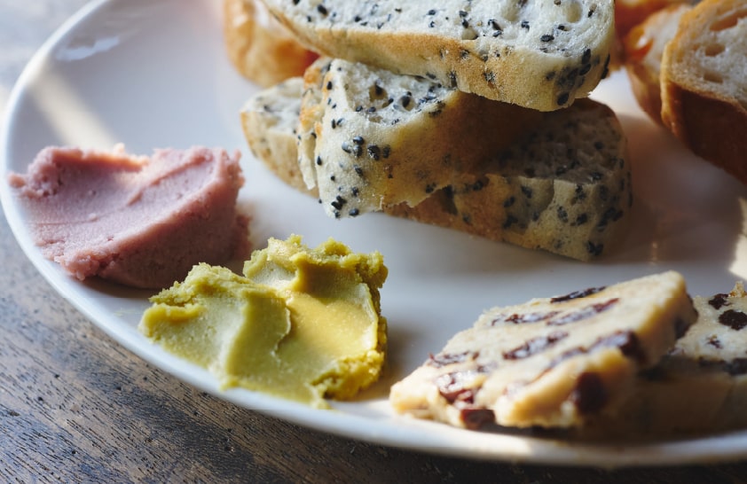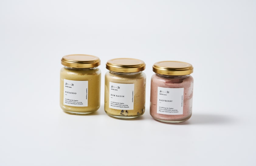 プチラボベーカリーの店頭には、約100種類のパンが並ぶ。ハード系からソフト系、おかず系からおやつ系まで幅広いラインナップだが、その味の一つを支えているのが、北海道産のバターだ。ミルキーで風味豊か、パンとの相性も抜群。このバターを工房で丁寧にホイップし、ピスタチオ・ラムレーズン・ラズベリーを加えたものが「新しい朝 MINE butter」だ。