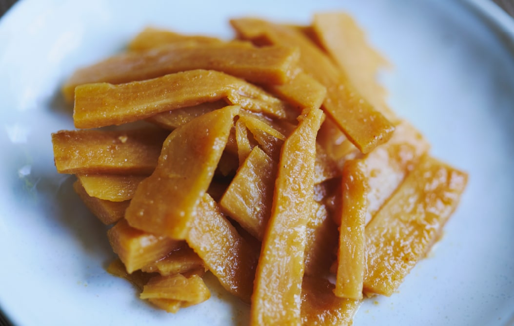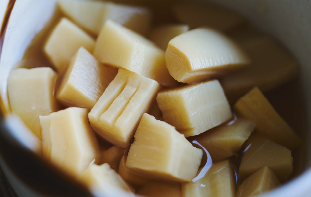 出汁煮は、たけのこを醤油やかつお節などで煮込んだもの。優しい味付けで、あっさりと食べられる。味付けが控えめな分、たけのこ本来の香りや食感を存分に楽しめる。