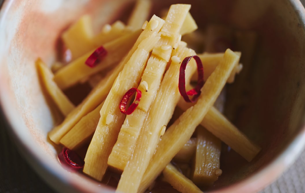 旨辛出汁煮は、たけのこをスライスして炒め、醤油や胡麻などで味付けしている。大きめにスライスしているので、コリコリとした食感が楽しめる。えぐみが少なく、パクパク食べ進められるのも魅力だ。