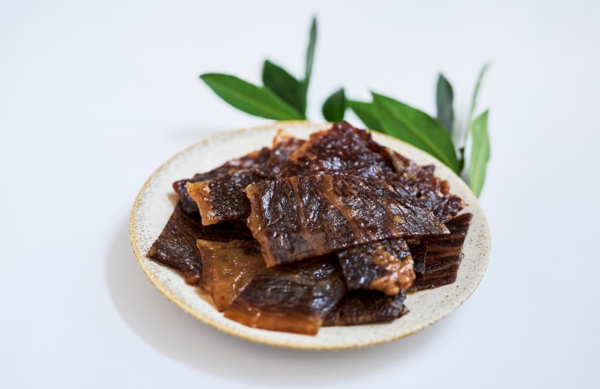 一般的な黒毛和牛が20数ヶ月で出荷されるところ、32ヶ月から最大40ヶ月という長期肥育を採用している梶岡牛。肥育中は「食材である前に礼をもって命と向き合う」という考えのもと、牛にとって快適な環境が徹底的に整備される。こうして育て上げられた梶岡牛は、滋味あふれる美味しさが特徴。肉本来の味を存分に堪能できると評判だが、その美味しさを贅沢に凝縮した商品が、梶岡牛ジャーキーだ。