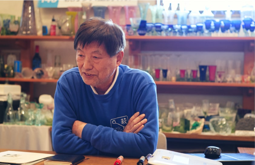工房に入るとすぐに代表取締役を務める藤田洪太郎さんが出迎えてくれました。ガラスの歴史や原石からの一貫生産について淀みなく語るその姿に、自らを「技術屋」という藤田さんの矜持が垣間見えます。工房内に並ぶのは思わず見入ってしまうほど美しいオリジナル製品の数々。同業者からの見学依頼も絶えません。しかし、ここへ至るまでには試行錯誤の日々があったのだとか。萩ガラスの歴史を紐解きながら、藤田さんの歩みと萩ガラス工房の挑戦について伺いました。