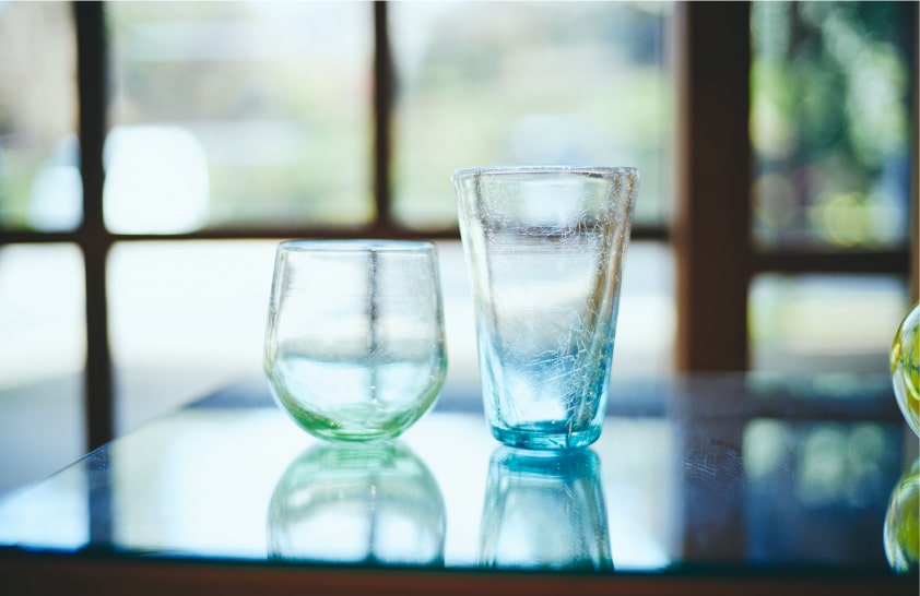 製作途中で水に入れて強制的に表面のヒビを発生させる通常市販のひびガラスとは違い、萩ガラス工房の内ひび貫入ガラスは熱湯にも耐えうる。コーヒーカップなどとして日常的に使っていると中間層のヒビが自然に「成長」して表情を変えていく。ヒビが入りきるには3年ほどの月日を要するそうだ。自然発生のヒビが描き出すオンリーワンの模様を楽しみたい。