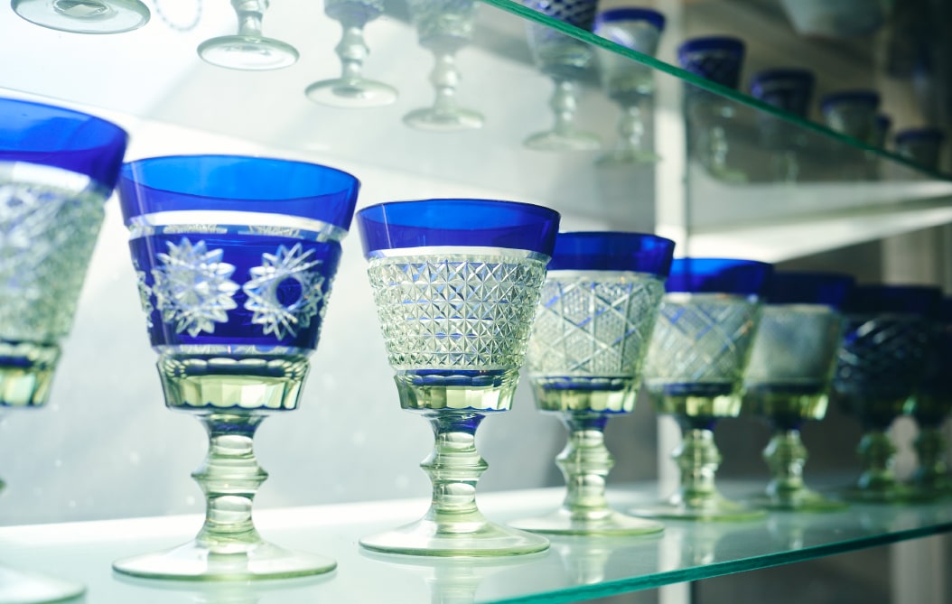 繊細な見た目ながら硬さと丈夫さを兼備している点も萩ガラス工房が手掛けるガラスの特徴だ。こちらの工房では創業当初より最高温度1520℃の窯でガラス作りをしている。国内のその他ガラス工房が1200~1250℃の窯にて取り扱うのは軟質ガラス(ソーダガラス)素材。300℃のエネルギー差が強度の高い硬質ガラス(カリガラス)の生産を可能にする。