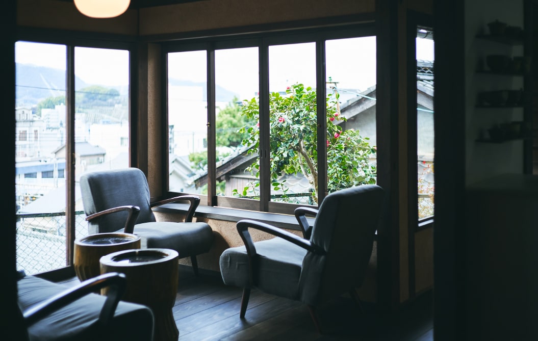 「オーガニックのお茶はもちろん、尾道を感じてもらえるのも当店の魅力」と髙橋さん。2階にある飲食スペースの窓からは尾道の街並みを臨むことができる。また茶器やお盆、椅子などは備後産のものを使用しており、地域の工芸文化にも触れられる。