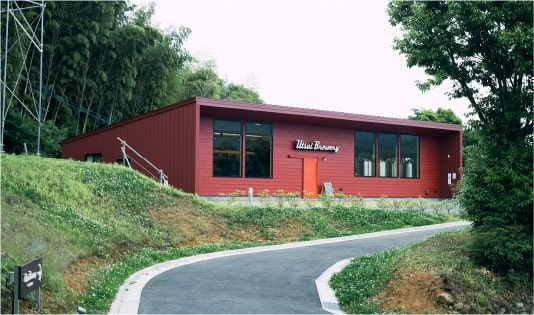 ビール瓶を思わせる鮮やかな色味が目を引くうついブルワリー。内日の田園風景に映える外観ながら、赤褐色が特徴的な周囲の石州瓦にうまく馴染んでいる様子が印象的だ。壁には大きく掲げられた「Utsui Brewery」の文字。その右手で醸造が行われており、左手がタップルームとなっている。
