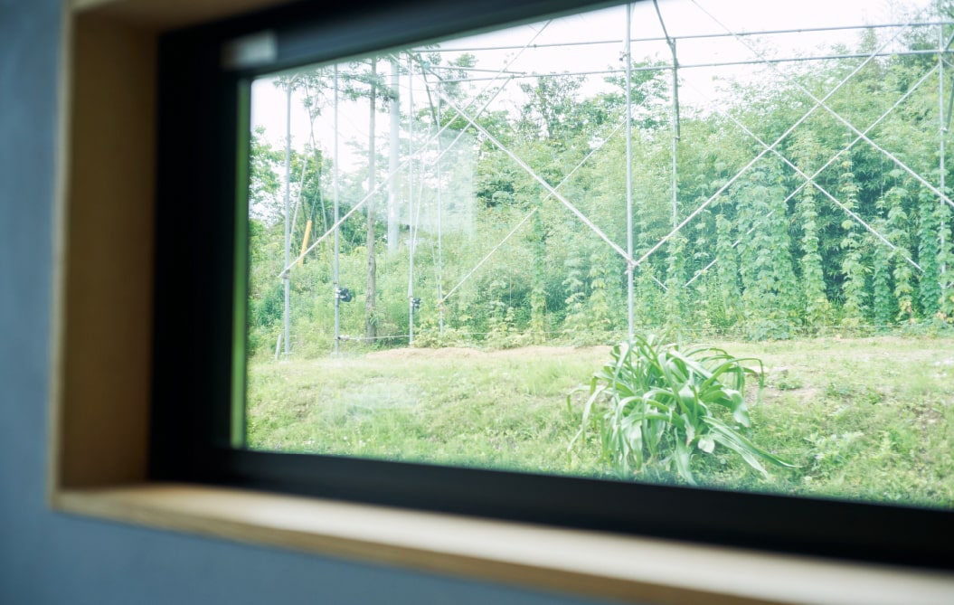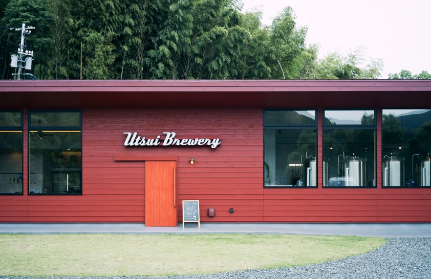 ビール瓶を思わせる鮮やかな色味が目を引くうついブルワリー。内日の田園風景に映える外観ながら、赤褐色が特徴的な周囲の石州瓦にうまく馴染んでいる様子が印象的だ。壁には大きく掲げられた「Utsui Brewery」の文字。その右手で醸造が行われており、左手がタップルームとなっている。