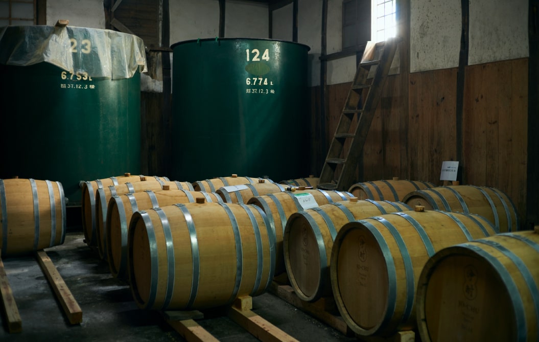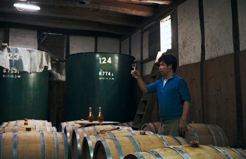 浄酎が熟成されている樽貯蔵室で品質を確認する三宅さん