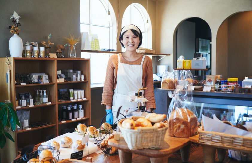 ebb&flowの店内に入ると種類豊富なパンと共に、店長を務める德本るみ子さんが出迎えてくれた。光浦さんがパン屋をオープンしようと決意した後に知り合ったという德本さん。以前は店舗を持たずに委託販売などを行っていたが、その頃の知人を介して縁が繋がり、ebb&flowの立ち上げから関わることとなった。