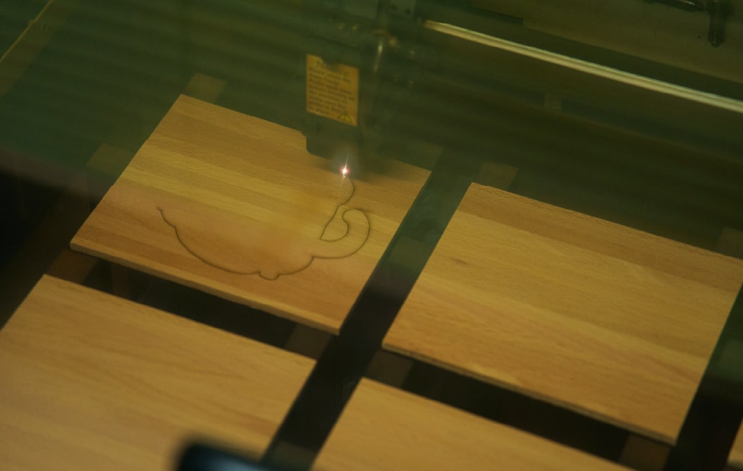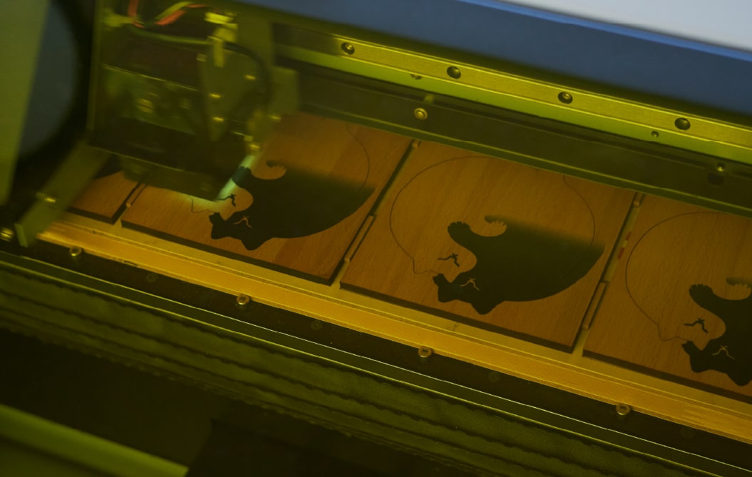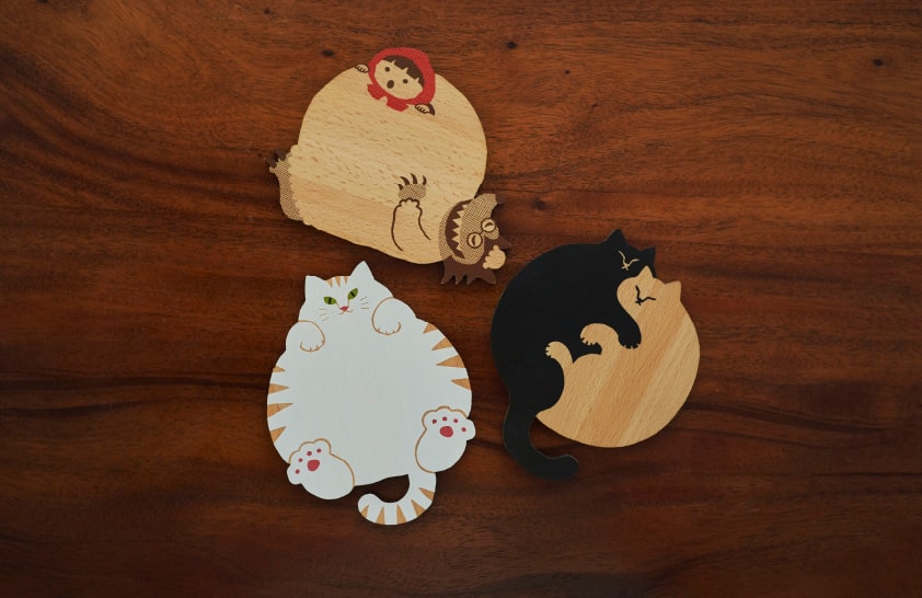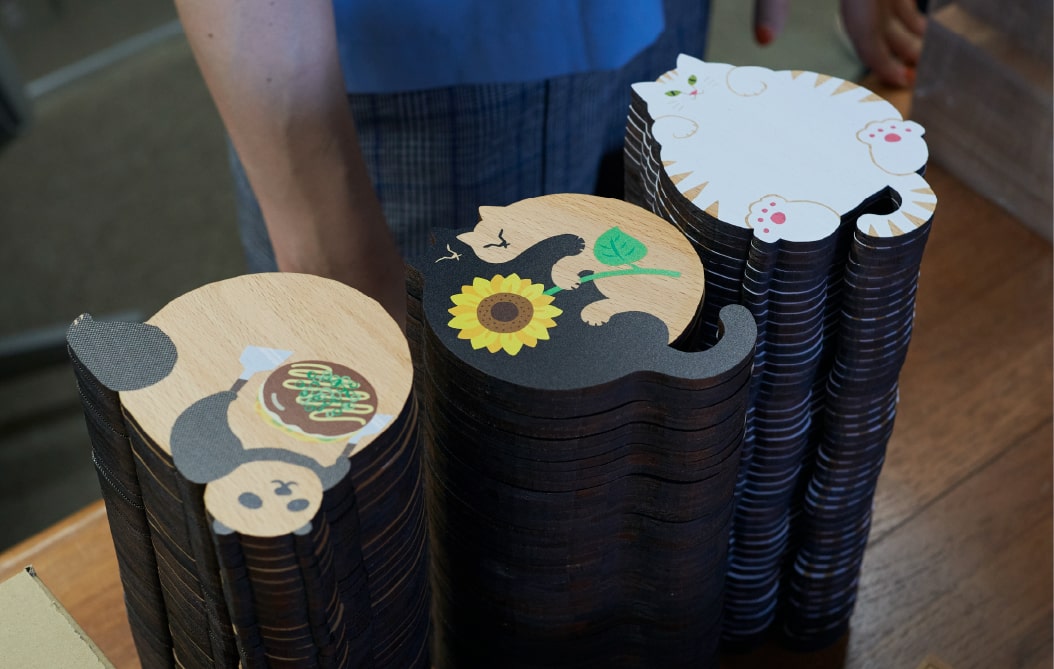 使用木材は、家具部材などをつくる際に出るヨーロピアンビーチ(欧州ブナ)の端材。積層技術で一枚板のように加工し、レーザーカッターでカット。そこにUVインクジェットプリンタでイラストをプリントしている。創業約50年の木工会社の技術が光る商品だ。