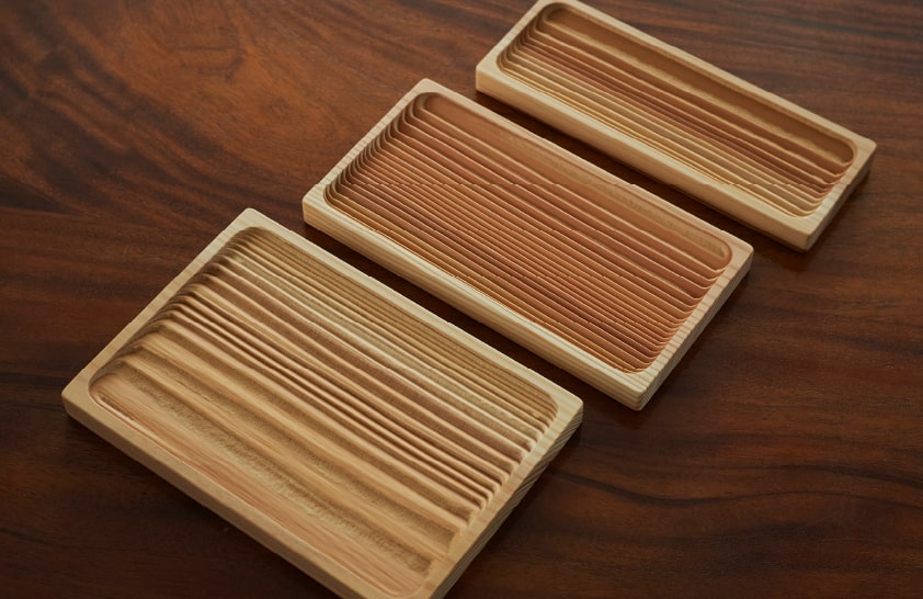 「育てる木製トレイ」の大きな特徴は、広島県産スギの無垢材を使用していること。スギはヒノキなどと比べて木目がはっきりと出やすいため、天然木の美しさを存分に感じられる。