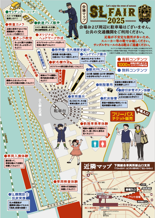 SLやまぐち号として活躍するD51をはじめとした山口県内の鉄道車両の展示や、ここでしかできない鉄道に係る様々なお仕事を体験できます(体験は有料です)。写真撮影は自由です。